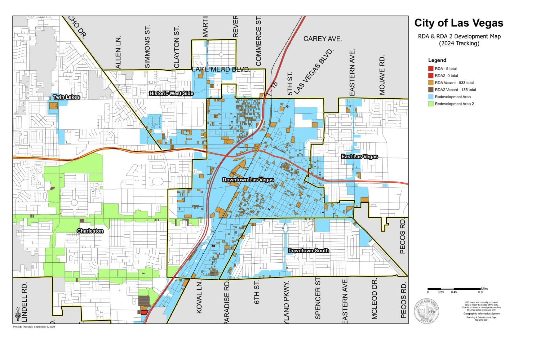 Map of Las Vegas with zoning overlays, showing different development areas, roads, and neighborhoods.