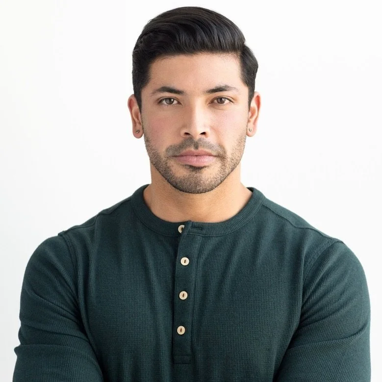 Portrait of a young man with dark hair and a beard, wearing a dark green long-sleeve shirt, standing against a plain white background.
